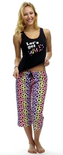 | This two piece lounge set features a cotton rib tank top with contrast scalloped stitching and ultra-cute screen print. The capris have a colorful all-over print and a functional drawstring. ...Read more |