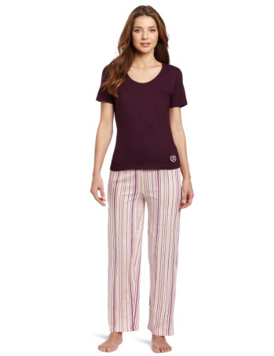 | Cotton solid knit tee and multi stripe printed pant sleep set with embroidery crest detail ...Read more |
